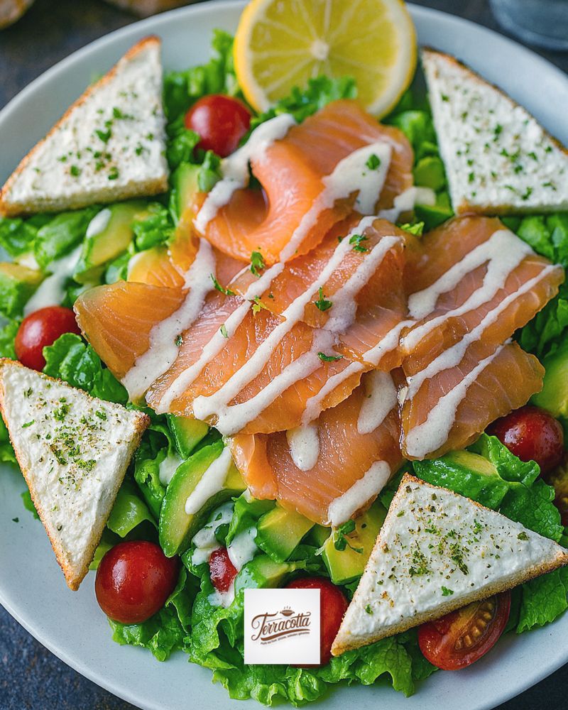 Salade fraîche, tomate cerise, avocat, toast au Saint Môret, saumon fumé, citron.